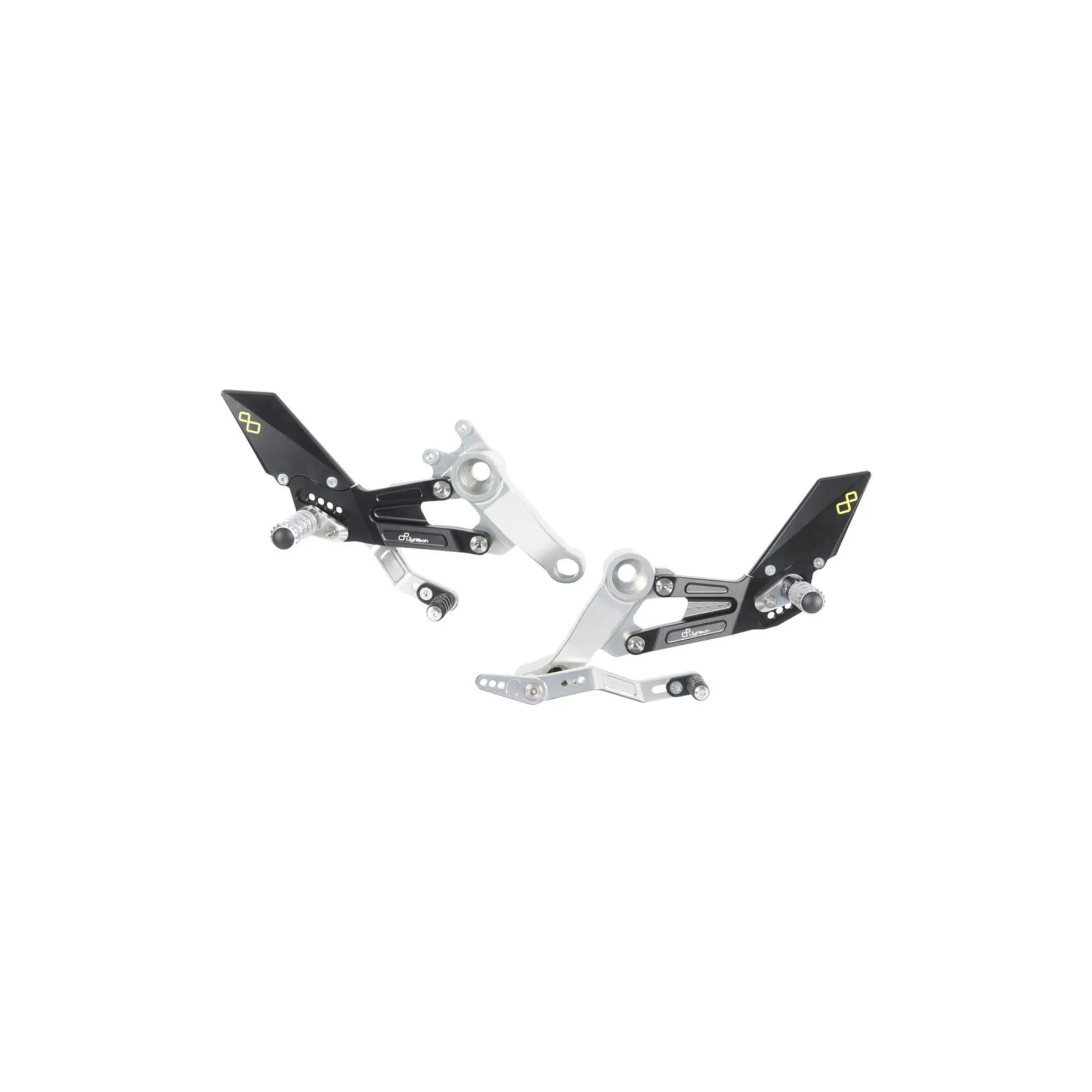 They are adjustable in height and backwards, offering multiple footpeg positions, which can be implemented with the aid of optional footpeg holders. Up to 3 high-quality bearings are integrated into the levers to withstand the most extreme stresses on the road, but especially on the track. The rearsets can be customized thanks to a wide range of accessories and spare parts.