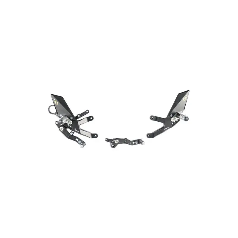 They are adjustable in height and backwards, offering multiple footpeg positions, which can be implemented with the aid of optional footpeg holders. Up to 3 high-quality bearings are integrated into the levers to withstand the most extreme stresses on the road, but especially on the track. The rearsets can be customized thanks to a wide range of accessories and spare parts.