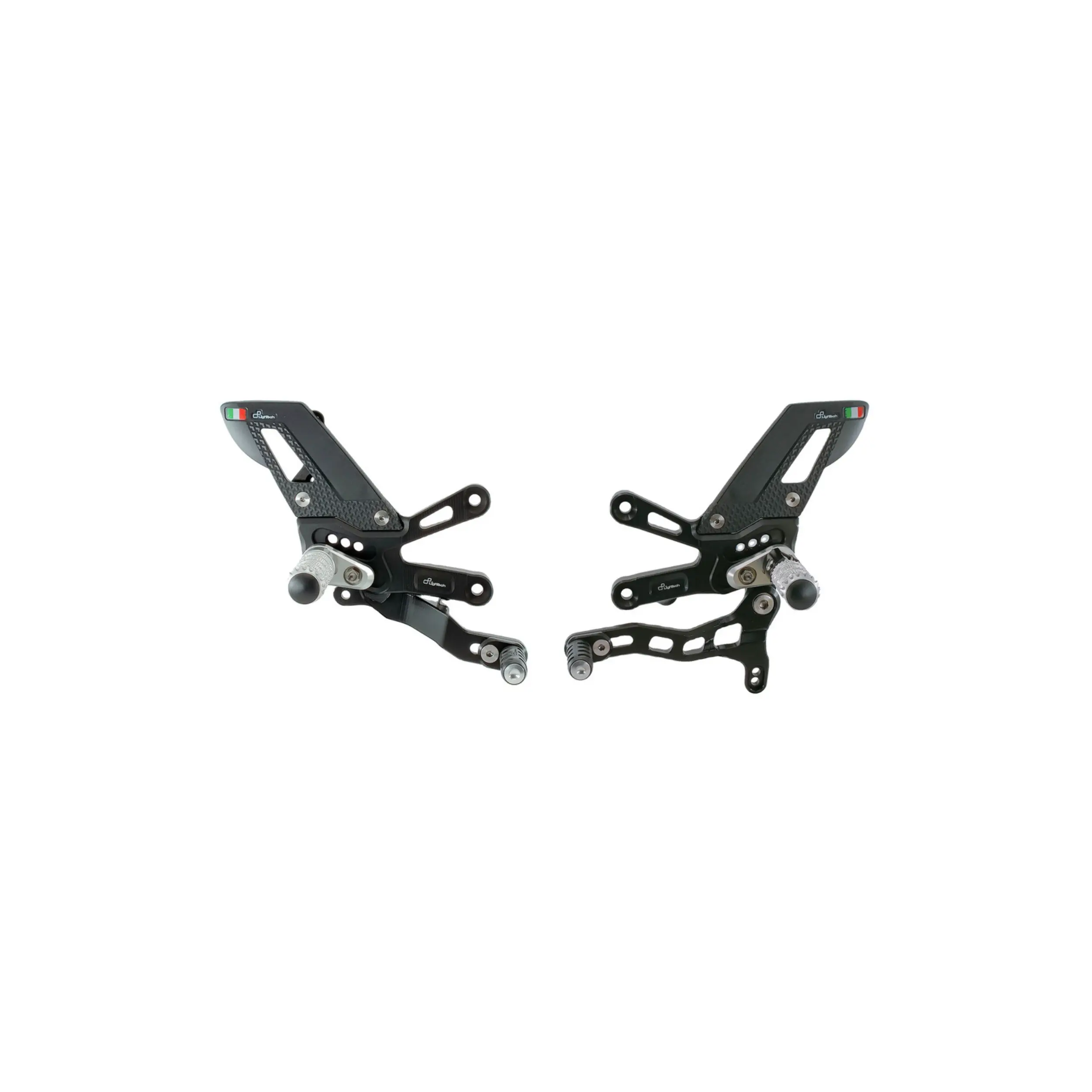 They are adjustable in height and backwards, offering multiple footpeg positions, which can be implemented with the aid of optional footpeg holders. Up to 3 high-quality bearings are integrated into the levers to withstand the most extreme stresses on the road, but especially on the track. The rearsets can be customized thanks to a wide range of accessories and spare parts.