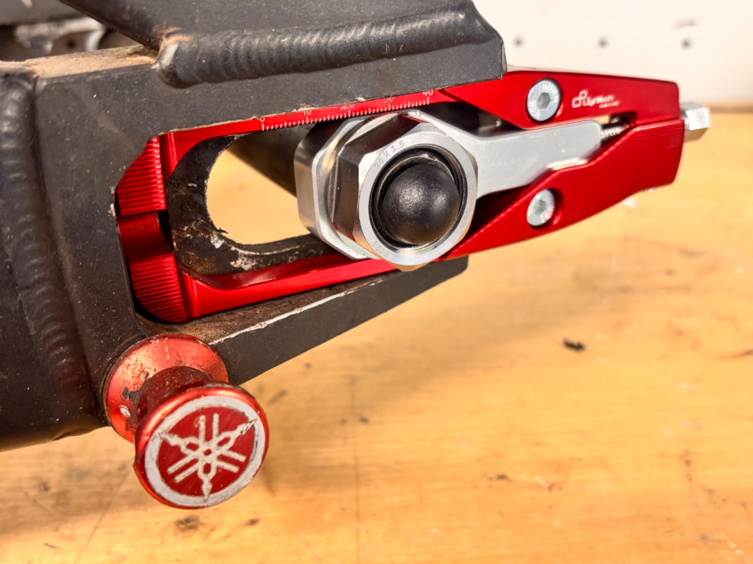 They provide more accurate and easier chain adjustment than stock chain tensioner. They feature an external screw adjustment for faster and more precise tuning. A laser graduated scale is engraved on the chain adjuster which facilitates adjustment.